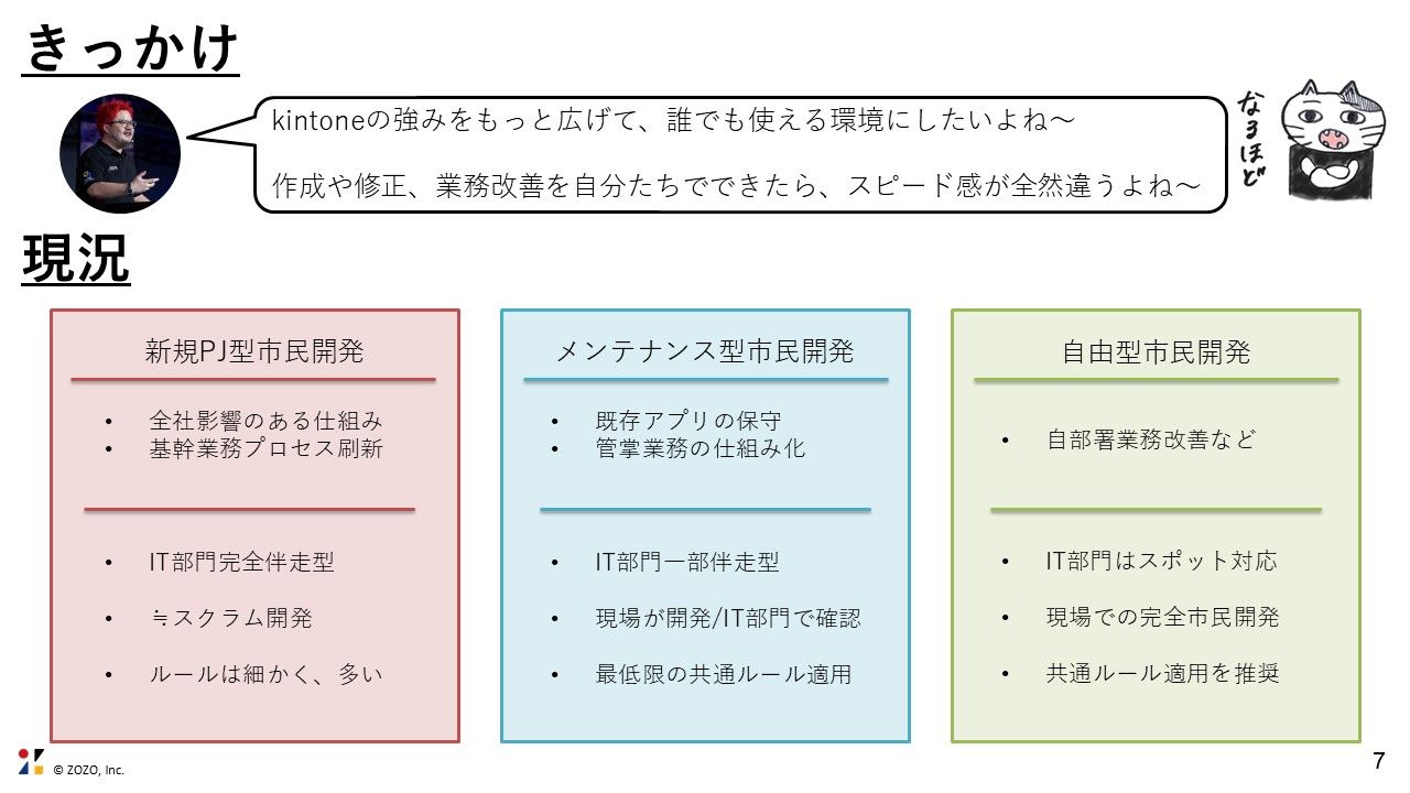 「自律」と「ガバナンス」の両立には、市民開発者の育成・教育も欠かせない。ZOZOでは市民開発者を支援するため、IT部門が3タイプ別に伴走支援のパターンを定義し、新井氏を中心に手厚いサポートを行っている。