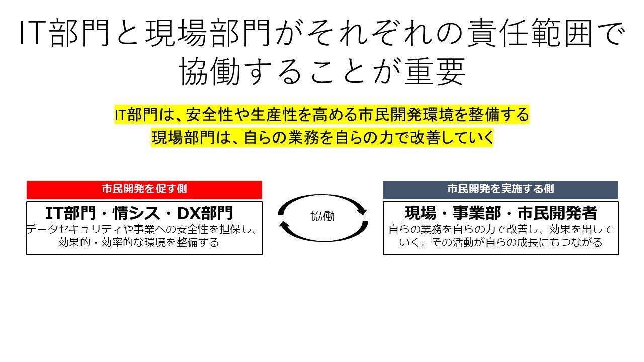 「IT部門は事業部門に綿密にヒアリングし、なぜその機能が必要かを明らかにしながら、システムの機密性・完全性・可用性を保証します。そして市民開発者は、業務に対してアプリ運用が適切か、利用者が使いやすくなっているかを保証します」(新井氏)