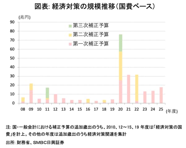 石破政権は、衆院選で補正予算の増額を掲げたことで、前年度を小幅に上回る規模に設定した。高市政権は、自民党総裁選で積極財政を掲げたことで、前年度をさらに上回る規模に設定している。