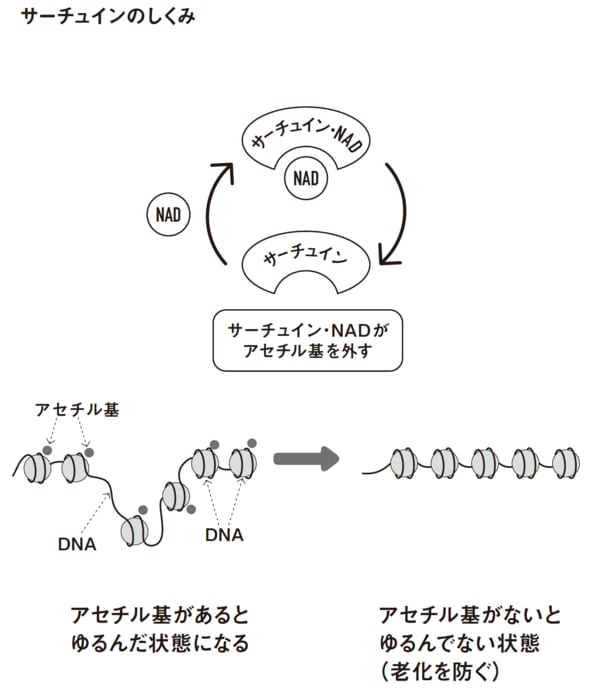 サーチュインがアセチル基を外すということは、つまり、サーチュインがDNAの情報に余計なことをさせずに、現状を維持する役割を担っているということです。