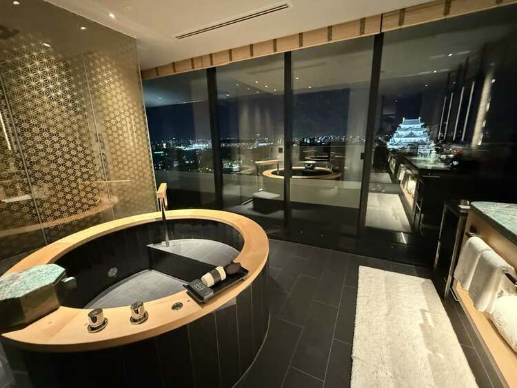 最上階スイートのバスルーム ライトアップされた名古屋城天守が視線の高さに
