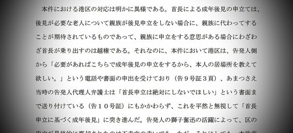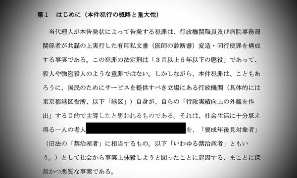 こうした一連の経過を受けて、洋子さん側はことし1月末、港区の職員や病院の関係者を有印私文書変造・同行使の疑いで東京地検と警視庁に刑事告発した。成年後見人を必要とするほど認知能力が低下していないにもかかわらず、港区が行政権限で成年後見人の選任を家庭裁判所に申し立てた際、文書の変造が行われたと疑いがある、としたのである。