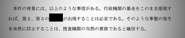 『本件告発の目的は、直接的には、本件犯行を実行した行政機関及び病院関係者の処罰を求めることにあるが、間接的には、そのような行政機関の行動に対し警鐘を乱打し、今後の同種違法行為の発生を阻止することにもある』