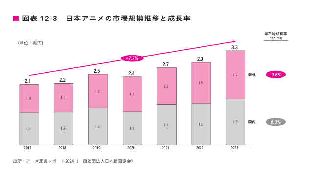 日本アニメの市場規模は2023年時点で3.3兆円を超えました。17年から年率平均7.7%で成長しており、その大宗は北米をはじめとする海外市場が占めていることから、急速なグローバル化が日本アニメをけん引しているといえます。