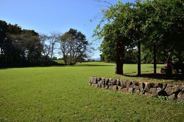 園路を登ると住吉神社の社殿が建っていて、裏手が主郭と二ノ曲輪である。二つの曲輪の中は広々とした芝地でベンチや藤棚もあるから、お茶やお弁当をもって訪れるのもよさそうだ。