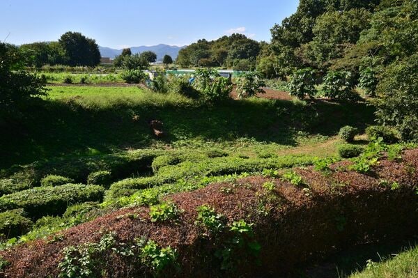それでも、二ノ曲輪の土塁に登れば、奥多摩の山並みをバックに空堀を見下ろすことができる。畠となって深さこそ減じているものの、かなり大きな空堀だ。二ノ曲輪の南側に開く虎口から土橋を渡ると帯曲輪に出るが、ここには両側から横矢が掛かるようになっている。