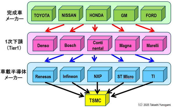 ここまで見てきたように、2011年3月11日の東日本大震災ではルネサス那珂工場が被災し、その影響でトヨタのプリウスが生産できなくなった。さらに2021年の年明けには、TSMCに生産が集中していた28nm車載半導体の供給不足が発生し、日米独の主要自動車メーカーが一斉に生産停止へ追い込まれた。そして今回は、オランダのネクスペリアが車載向けディスクリート半導体の出荷を止めた結果、多くの自動車メーカーが生産停止や減産を余儀なくされている。