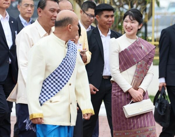 ラオスの民俗衣装姿でビエンチャンの「タートルアン大塔」に到着された愛子さま(2025年11月18日、写真:代表撮影・共同通信社)