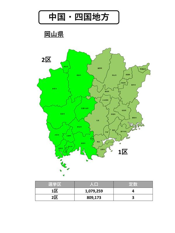 自民・維新が検討合意した「中選挙区制」、導入で選挙区はこうなる【47都道府県・新区割り完全シミュレーション】 立憲衆院議員らが全154選挙区の独自案を初公開、超党派で静かに熱帯びる衆院「中選挙区連記制」への改革機運 津村 啓介 立憲民主党衆議院議員 著者フォロー フォロー中 大井 赤亥 政治学者 著者フォロー フォロー中 政治 2025.12.3(水) Tweet 1 2 3 4 5 6 7 8 9 10 【中選挙区連記制・区割り案】中国・四国地方 【区割り案】岡山県 ギャラリーページへ 【区割り案】広島県 ギャラリーページへ 【区割り案】山口県 ギャラリーページへ 【区割り案】鳥取県、島根県 ギャラリーページへ 【区割り案】愛媛県 ギャラリーページへ 【区割り案】徳島県、香川県、高知県 ギャラリーページへ Tweet あわせてお読みください 自民党の衝撃的敗北で動き出す「大連立」、政局のカギは「中選挙区連記制」への選挙改革【立憲国会議員が緊急提言】 47都道府県・全465議席シミュレーション、政権中枢がほのめかす新衆院選制度でこうなる 津村 啓介 | 大井 赤亥 【やさしく解説】なぜ今、議員定数削減なのか…政治とカネ問題から目を逸らすため?削減の歴史と課題とは フロントラインプレス 【やさしく解説】なぜ企業・団体献金はなくならないのか?50年続く「政治とカネ」の問題、議員定数削減で後回しに フロントラインプレス 「女性初・高市首相」誕生を祝えぬリベラル派、「女装した安倍晋三」「中身は男」の言説が促す現役世代の左派離れ 【大井赤亥の国会通信】「左派=改革に水を差す保守・老害」、現役世代の認識を変える道は? 大井 赤亥 「口裂け女」「肉屋を支持する豚」高市首相や参政党に向かうリベラル派の過剰な正義、混迷のアイデンティティ政治 【大井赤亥の国会通信】タガの外れた言説で世論と乖離する左派、求められる目標の再定義 大井 赤亥 政治を読む バックナンバー 一覧 「政治家は皆嘘つきだ」と私が公言するワケ、自民・維新の定数削減もそうだった、政治批評に欠かせない距離の取り方 西田 亮介 給食無償化への懸念「中身がショボくなる」、立憲が推す「食料品消費税ゼロ」は給食の質低下を止める切り札となるか 西田 亮介 | 吉田 晴美 「ちょっと吉田さん、ヤバいよ」立憲幹部が絶句した大学院生の評価、SNSで叩かれやすい野党第一党のリアルな現在地 西田 亮介 | 吉田 晴美 【斎藤知事再選から1年】NHK党・立花氏は逮捕、自死に追い込まれた元兵庫県議の妻の決意と他人事貫く斎藤知事 松本 創 日本国旗を燃やすのはけしからんが…参政党が主張「国旗損壊罪」新設に反対する理由、風刺も芸術的表現も委縮の恐れ 西田 亮介 維新・藤田共同代表の秘書への公金還流疑惑、法の隙間を突き「法的にOK」で済むはずがない、政治家が守るべき倫理観 西田 亮介 Sponsored フォロー機能について フォロー機能とは、指定した著者の新着記事の通知を受け取れる機能です。 フォローした著者の新着記事があるとヘッダー(ページ上部)のフォロー記事アイコンに赤丸で通知されます。 フォローした著者の一覧はマイページで確認できます。 ※フォロー機能は無料会員と有料会員の方のみ使用可能な機能です。 設定方法 記事ページのタイトル下にある「フォローする」アイコンをクリックするとその記事の著者をフォローできます。 確認方法 フォロー中の著者を確認したい場合、ヘッダーのマイページアイコンからマイページを開くことで確認できます。 解除方法 フォローを解除する際は、マイページのフォロー中の著者一覧から「フォロー中」アイコンをクリック、または解除したい著者の記事を開き、タイトル下にある「フォロー中」アイコンをクリックすることで解除できます。 ご登録 ログイン