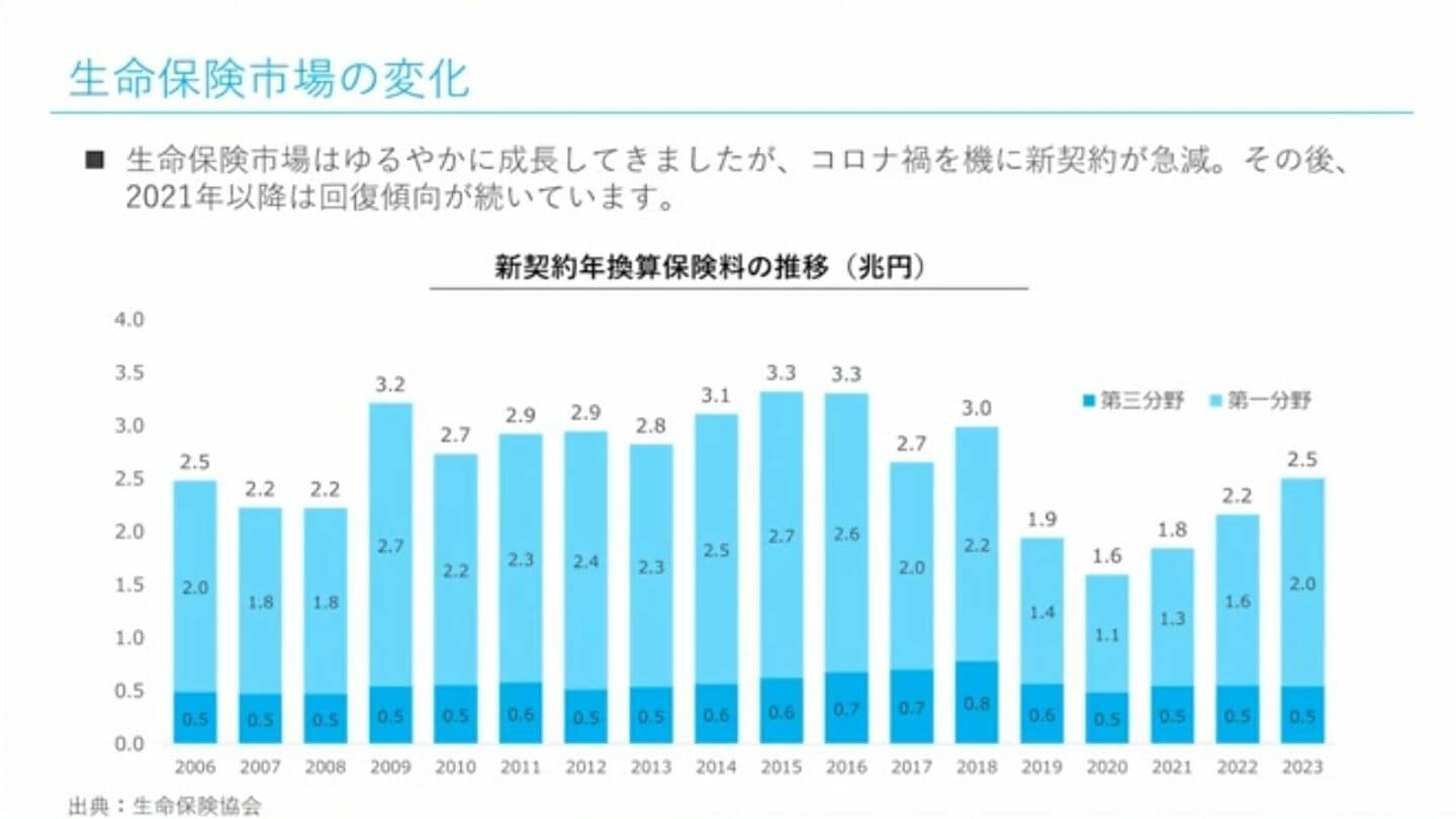 ここ20年間、生命保険の市場規模は、緩やかに成長してきました。保険は大きく3つに分類され、第1分野は生命保険で、第2分野は損害保険、第3分野は主にがん保険や医療保険など、それ以外の保険を指します。