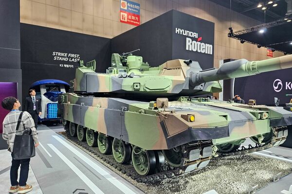 2025 年ソウル国際航空宇宙防衛展示会で現代グループによって発表されたポーランド版「K2」戦車。ポーランドは韓国軍需産業の主要輸出先となっている(写真:Igor Ivanov/TASS via ZUMA Press/共同通信イメージズ)