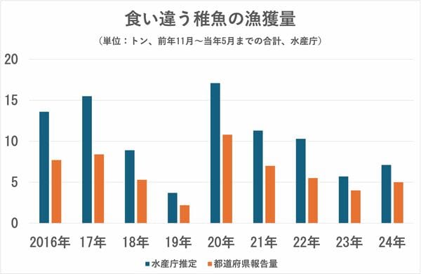 国内でシラスウナギ(稚魚)を漁獲(採捕)するには許可とその報告が義務付けられている。ところが、都道府県が報告量をまとめた数値と、水産庁が実際に養殖池に投入された池入れ量から稚魚の輸入量を引いて算出した推定漁獲量には常に差がある。昨年(2023年11月〜24年5月)は少ない方だが、それでも差は2.1トンある。この「差」は未報告で漁獲されたことを意味する。