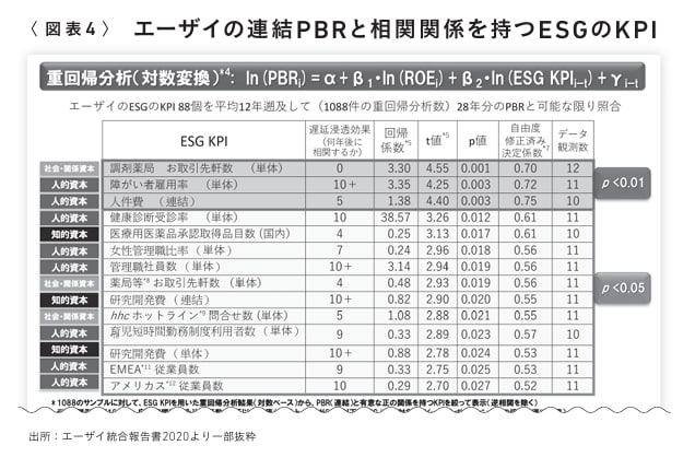 柳: 先ほどの数式を用いて、エーザイのESGのKPI(重要業績評価指標)88種類を平均12年分さかのぼり、さらに28年分のPBRと共に可能な限り分析しました。例えば、2000年の女性管理職比率がいつ株価に効いてくるかをシミュレーションし、その関係を回帰分析で数万件回すのです。その結果、PBRと有意な正の相関係数を持つKPIと、それらが「何年後に相関するか」が明らかになりました(図表4)。この中から相関が顕著だった項目をピックアップしたのが図表1の「エーザイにおける柳モデルのハイライト」です。
