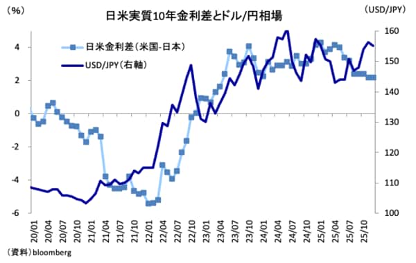 以下の図表に示しているように、2022年以降、日米実質金利差は急拡大しており、円安相場とおおむね安定した関係があるようにも見える。