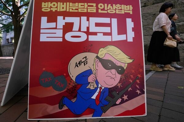 ソウルの路上には、トランプ大統領の対韓国関税政策に反対の意を表する、トランプ氏の似顔絵が描かれた立て看板が登場した。「あなたは強盗なのか」と書かれている(写真:AP/アフロ)