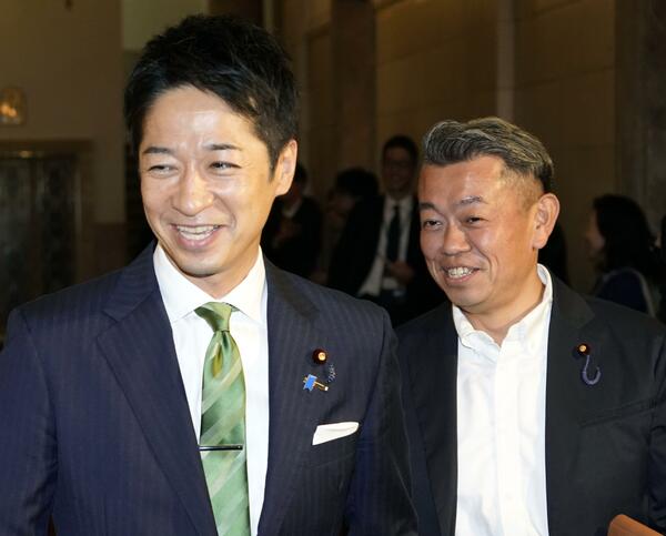 日本維新の会の奥下剛光衆院議員(右)と藤田文武共同代表=2025年10月20日、国会(写真:共同通信社)