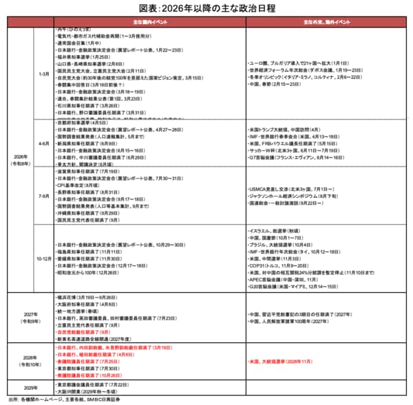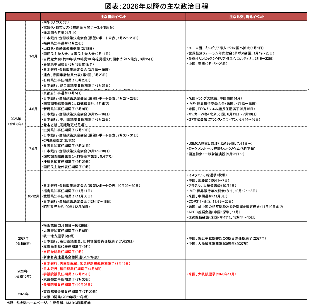 急ぎたい理由と遅らせたい理由を両立させるタイミングとしては、②2026年春もしくは③2026年夏となるのではないか。「責任ある積極財政」を反映した当初予算を成立させた上で、高市首相は政権の信を問う可能性が高いと考える。