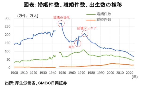 まず、60年に1度の「丙午(ひのえうま)」に当たり、出生数に影響が出るか注目される。1966年の出生数は136.1万人となり、前年比▲25.4%、前年差▲46.3万人の大幅減少を記録した。「丙午生まれの女性は気性が激しい」等といった迷信が強く影響した。現代では、このような迷信は薄れているため、影響は相対的に小さいと考えられるが、実際の推移が注目される。