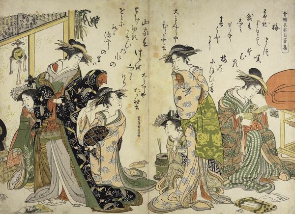 山東京伝『吉原傾城新美人合自筆鏡』1784年(天明4年)。吉原の裏舞台を画題に山東京伝画、太田南畝序、朱楽菅江跋で描かれた、蔦重の人脈が発揮された作品