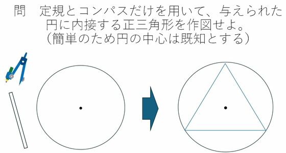 コンパスと定規(1ミリ刻みのメジャーの目盛りなどが入っていないもの)だけを用いて、このような極めて単純な作図をしてみよと問う時点で、教育としてセンスが欠如しているのですが、そういう点にはここでは触れません。