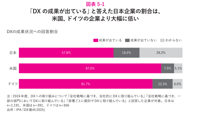 また、ここ数年間過熱しているDXブームのなかで多額のデジタル投資を行っているものの、日本企業のDXはそこまで進んでいないのが実状だ。実際に、IPAの同調査でDXの成果が出ているかという質問に対し「成果が出ている」と答えた企業の割合は、欧米が80~90%であるのに対して、日本は約58%にとどまっている(図表5-1)。