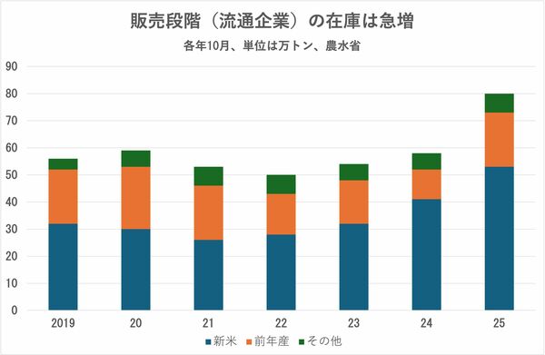 結果として、売れない新米は在庫として積み上がった。農水省は農協などの出荷段階と販売段階(玄米の仕入れ量が年間4000トン以上)の在庫量を集計している。直近10月時点では出荷、販売段階合わせた在庫量は306万トンと前年同月比で62万トンも増加。とりわけ販売段階の在庫は80万トンと過去7年でもっとも多く、新米だけで53万トンに膨らんだ。
