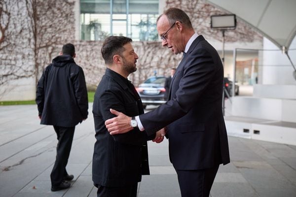 12月15日、ドイツのメルツ首相と会談したゼレンスキー大統領(写真:POU/ROPI via ZUM Press/共同通信イメージズ)