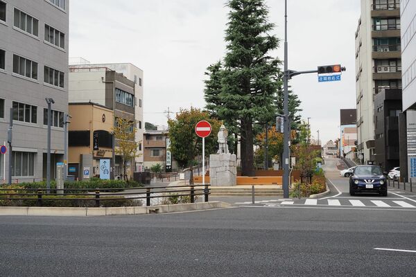 写真6:惣構東側の塁壕跡は緑道となっており、徳川諸将の像が立っている