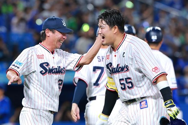 DeNAとの試合に勝利し、高津臣吾監督(左)と抱き合うヤクルト・村上宗隆=8月12日(写真:産経新聞社)