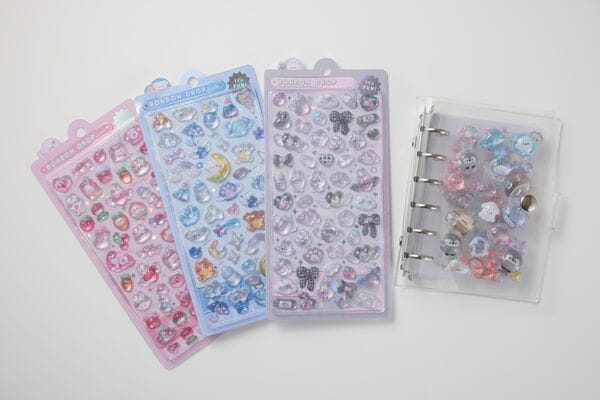 特徴的なのは、シールの立体感です。一般的なシールでは厚みをほとんど感じませんが、ボンボンドロップシールには2〜3ミリの厚みがあり、シールに描かれた絵やキャラクター、文字などがぷっくりと丸みを帯びて立体的に浮き上がっています。底部のシール部分と膨らんだ部分の両面に印刷が施されているのも特徴で、膨らんだ部分には樹脂が流し込まれています。光にかざすと、その樹脂部分が美しく光ります。