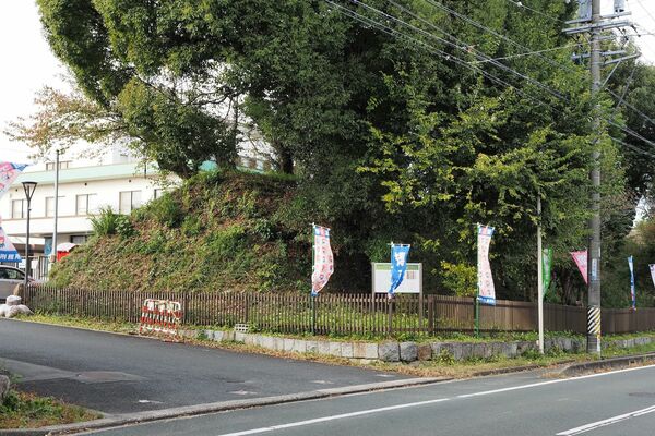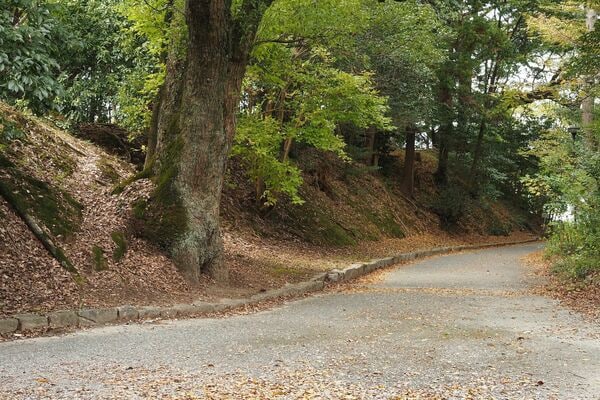 二ノ丸東面に残る土塁。画面左手が本丸方向で、左側の道は堀跡である