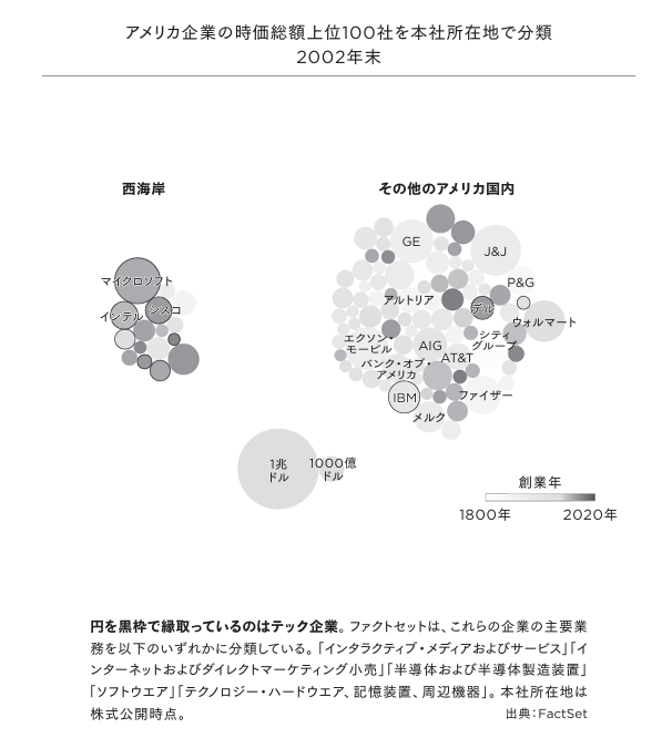 20年という時間を隔てて、アメリカの株式市場が大企業の稼ぐ力をどう測ったのかを見てみよう。下の図は、2002年末時点でアメリカ企業の時価総額上位100社を本社所在地別に分類したものである。