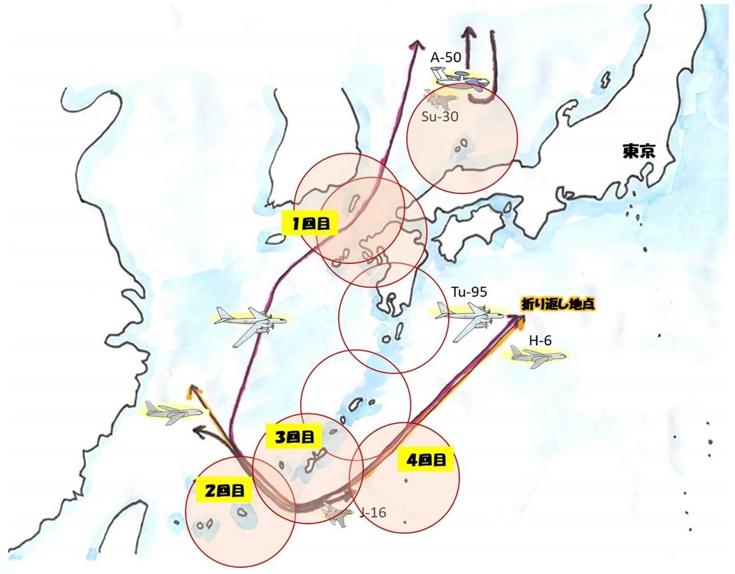 中国とロシアの爆撃機は、万が一戦争事態になれば、今回のような航跡で日本の南西諸島の上空を飛行できない。