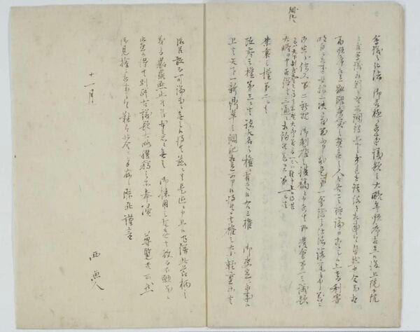 西周の政治的貢献が頂点に達したのは、慶応3年(1867)10月のことである。大政奉還を目前に控えた徳川慶喜から、今後の国家体制について諮問を受けた西は、イギリス議会制度や三権分立について詳述するとともに、日本史上初となる憲法草案ともいわれる「議題草案」をもって答申した。この草案は、彼のオランダでの学びを凝縮した、画期的な国家構想であった。また、「泰西官制説略」を併せて提出している。