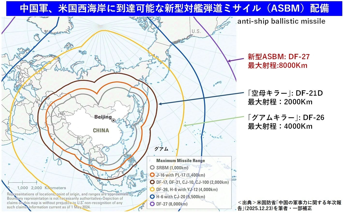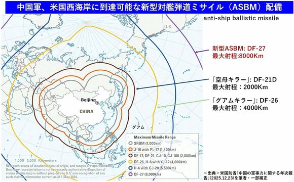 米国防省が12月23日に公表した「中国の軍事および安全保障動向に関する年次報告書」によると、中国軍のミサイル部隊が米国西海岸にまで到達可能な新型の対艦弾道ミサイル(ASBM)「DF-27」を運用していることが明らかになった。