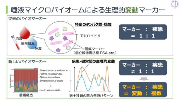 「生理的変動マーカーでは、マーカーと疾患の関係性を、このような1対1の関係性として捉えません。マーカーとしてたとえば唾液中の80種類の菌の発現パターンをチェックし、それらの変動状態をもとに複数の疾患を同時に見極めるのです」