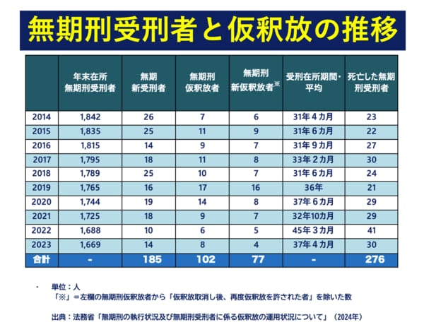 法務省が公表している「無期刑の執行状況及び無期刑受刑者に係る仮釈放の運用状況について」によると、2023年末時点で在所中の無期刑受刑者は1669人。これに対し、2023年までの10年間に仮釈放された者は実数で77人でした。平均すれば1年で10人足らず。受刑者数に占める割合も1%足らずとみられます。