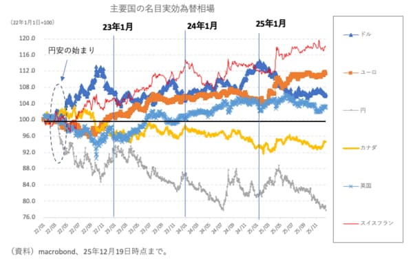 なお、2025年に限って言えば、年前半は「ドル離れ」相場の中、対米依存度の大きい円も一蓮托生で避けられ、10月以降は高市政権に対するリフレ懸念で円や日本国債の売りが強まったという特殊な側面もあった。