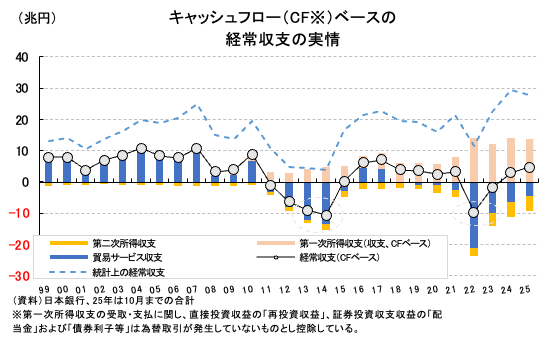 2024年以降は貿易赤字縮小に伴ってCFベース経常収支は黒字に復活した一方、2023年から2024年にかけては日米実質金利差の拡大・高止まりが円安を支えたと見られる(後述)。2025年も貿易赤字は一段と縮小が続き、CFベース経常収支も一段と黒字幅が改善したが、日米実質金利差という意味では縮小しつつも、相応の幅が残っている。やはりこれが円安相場を支えた疑いが強い。