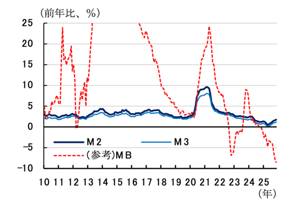 マネーストックはどうだろうか。MBの動きが日銀次第で大きく変わるのに対し、マネーストックは比較的淡々と増え続けている(図表2、図表3)。両者とも長期的に増加トレンドにある点は共通しているが、図表3に示されるような短期的なアップダウンにはあまり相関はない(例外は2020~21年のコロナショック期)。