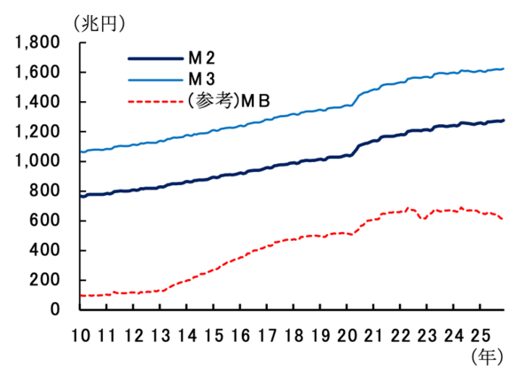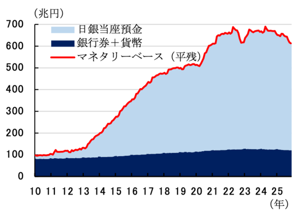 MBは異次元緩和前に100兆円台前半だったが、異次元緩和後に急増し、2021年~2024年前半は600兆円台半ば~後半で推移していた(図表1)。その後、日銀のバランスシート縮小開始(いわゆるテーパリング)を受けて緩やかに減少しており、足元は610兆円程度とピークから1割程度減少している。