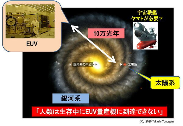 実際、2007年に開催されたリソグラフィの国際学会SPIEでは、基調講演者が次のように述べていた。「ここに銀河系がある。我々人類が住む地球は、この銀河系の中の太陽系に存在している。しかし、EUVの量産機は、地球から約10万光年も離れた場所にある。我々人類は、生存中にEUVの量産機にたどり着くことはできないだろう」(図3)。