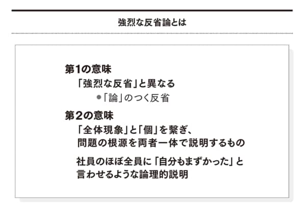 この流れのポイント。事業の不振を直そうとして、会社全体のワルさを抽象的にいくら語ったところで、組織の危機感が薄い状況は変わらない。個人をターゲットにした問題指摘に迫らない限り、山は動かないのだ。