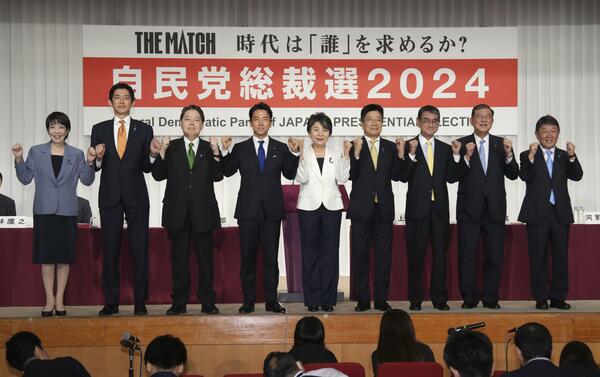 2024年自民党総裁選の共同記者会見を前に、記念写真に納まる(左から)高市経済安保相、小林前経済安保相、林官房長官、小泉元環境相、上川外相、加藤元官房長官、河野デジタル相、石破元幹事長、茂木幹事長=2024年09月13日(肩書は当時、写真:共同通信社)
