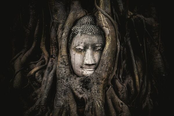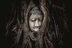 息をのむのは、1個の仏頭が大きな木の根に絡みとられ、目を伏せうっすら笑みを浮かべながら宙に浮いているのだ。ビルマ軍が容赦なく仏像の首を落とし、その内のひとつが菩提樹の根に包みこまれ、偶然いま“奇跡の姿”を留めているに違いない。菩提樹とは、釈迦がその下で悟りを開いた木である。