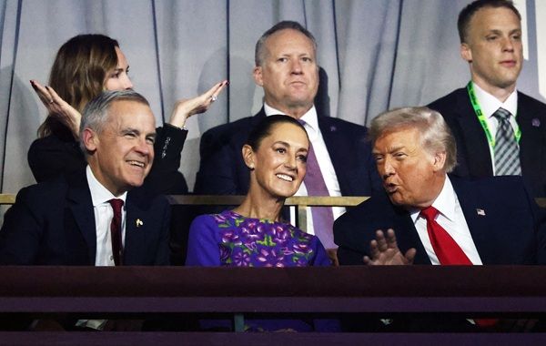 昨年12月5日のFIFAワールドカップ組み合わせ抽選会で顔を揃えた開催国の首脳。左からカナダのマーク・カーニー首相、メキシコのクラウディア・シェインバウム大統領、アメリカのドナルド・トランプ大統領(写真:ロイター/アフロ)