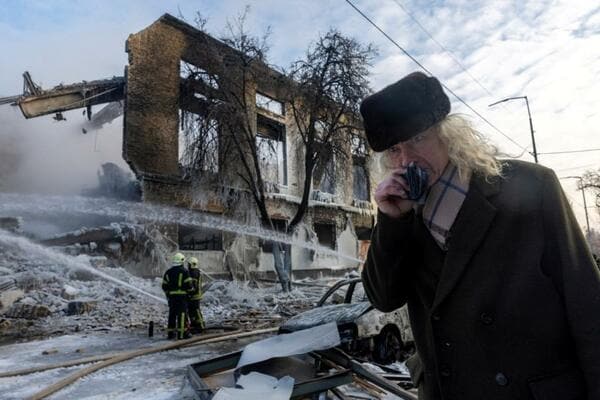 ロシアのドローン攻撃を受け破壊されたビルの前を歩く男性(1月12日、ウクライナの首都キーウで、写真:ロイター/アフロ)