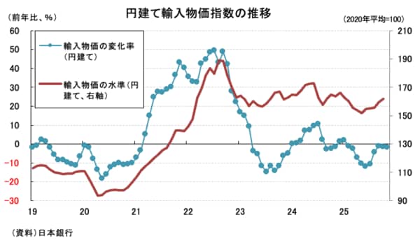 下の図表の円建て輸入物価指数を見ても分かるように、前年比でプラス圏に至るような事態にはなっていない。これは2025年上半期が円高地合いにあり、おおむね155円をトップとして下落傾向にあったためだ。