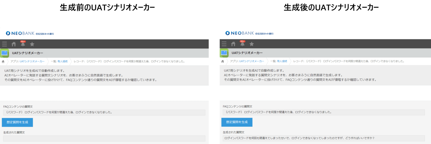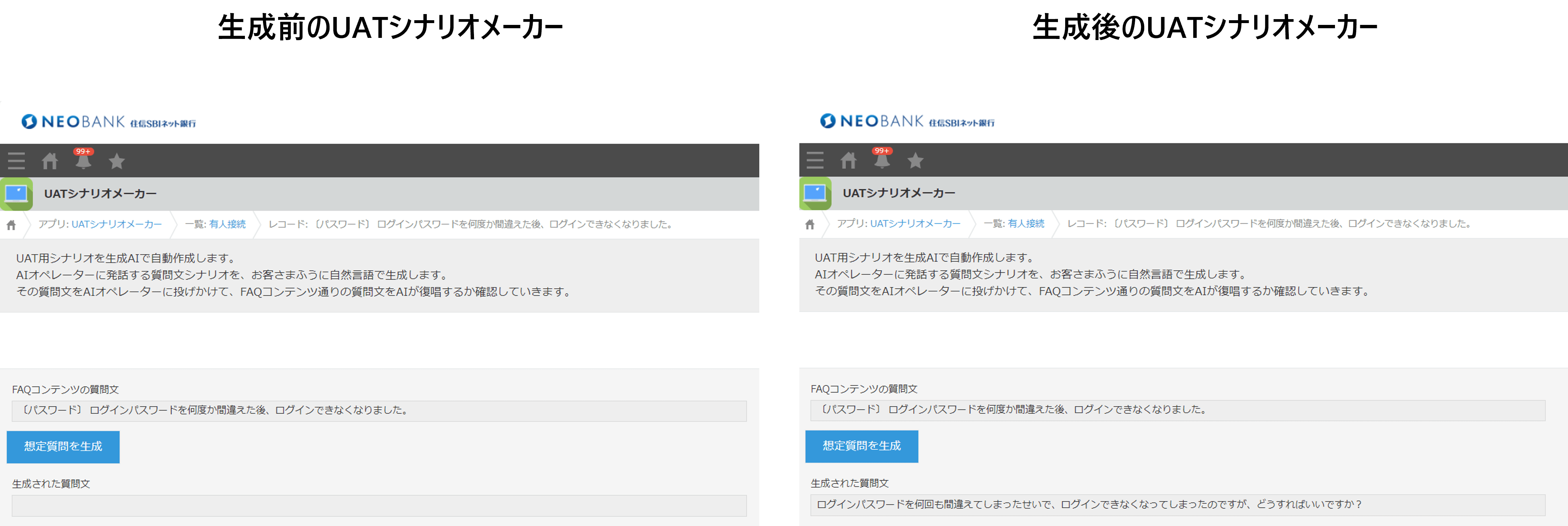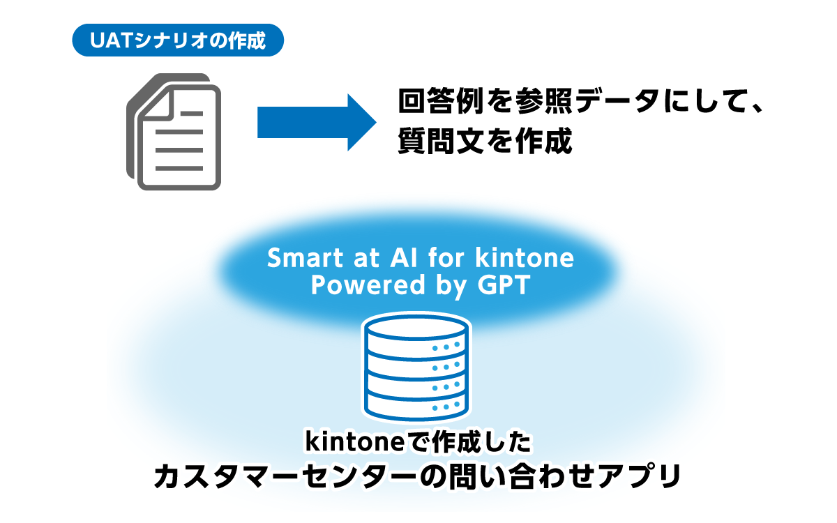 「内部の人間がテストシナリオを作成するとバイアスがかかり、シナリオが偏ってしまうケースも。そこで、話し言葉による質問のシナリオを生成AIに考えてもらっています。例えば”ログインできなくなった”という想定質問を、会話文形式で複数パターン生成AIに案出ししてもらい、その会話文をKore.aiに向かって発話して、どう回答するのかテストしてみるといった使い方です。想定質問をキントーンに入れてSmart at AIを実行するだけで、シナリオが作成できます」と加藤氏。