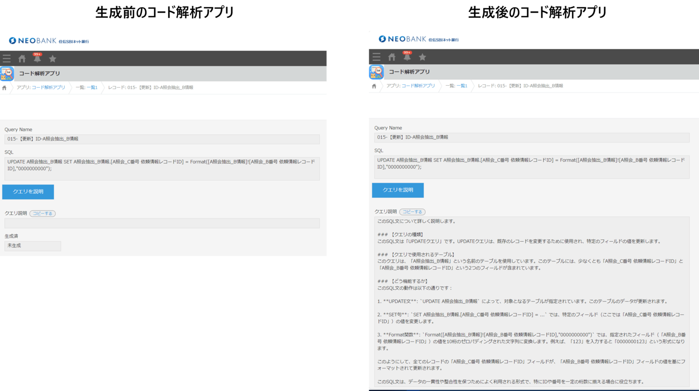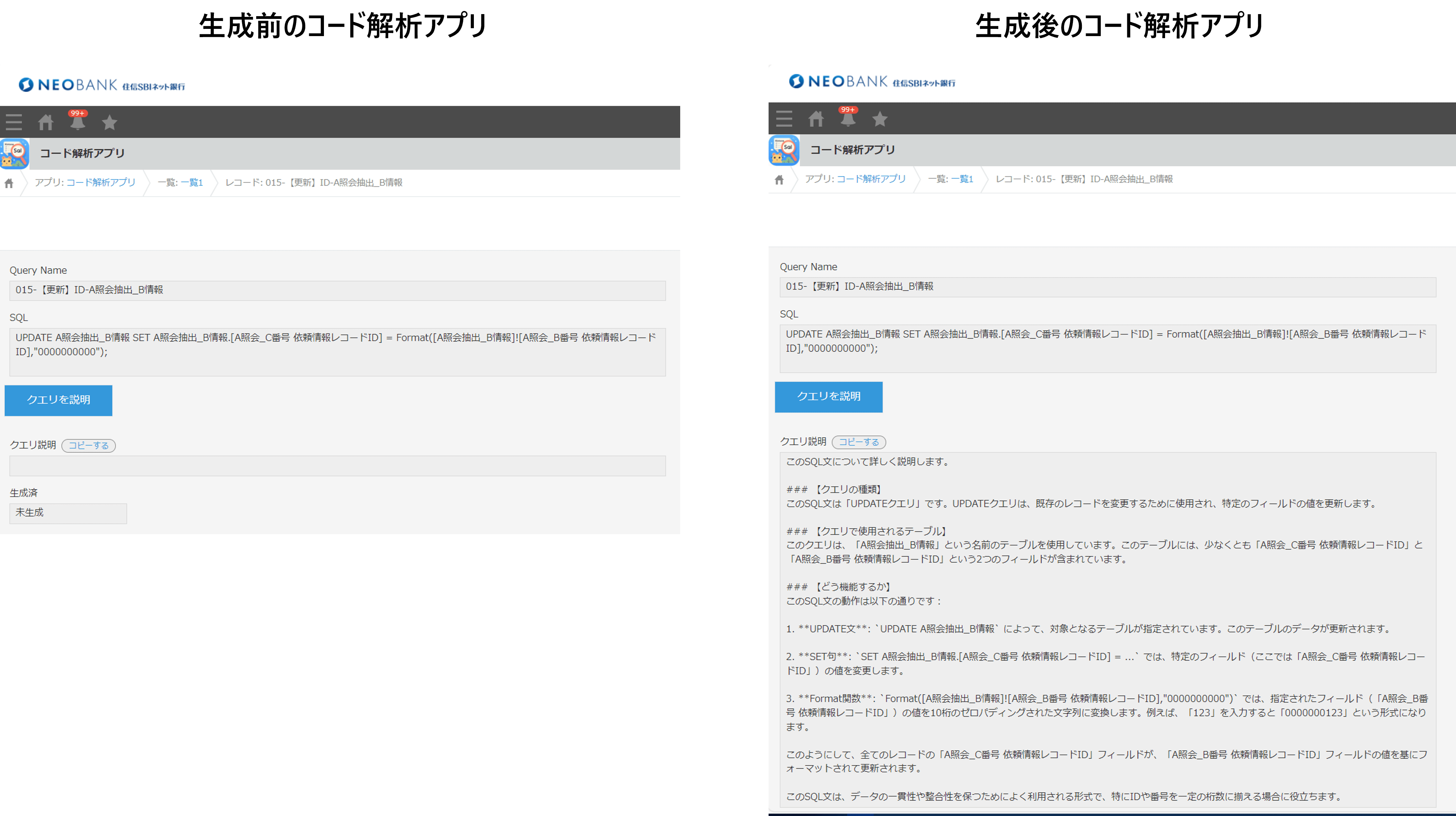 生成AIと連携してキントーンを活用しているアプリもある。コード解析アプリは、表計算ソフトやデータベースソフトのファイルに組込まれたVBAやSQLなどのコードを、わかりやすい日本語で一括出力することが可能だ。複数のコードをキントーンのレコードとして投入し、生成AIに説明してもらうことで、システム開発の当事者以外であっても、ファイルの構造を最新断面でドキュメンテーション化することができる。具体的には、M-SOLUTIONSが提供する「Smart at AI for kintone Powered by GPT(以下Smart at AI)」の連携により実現している。加藤氏は「キントーンから情報を出さずに言語処理をAPI経由で実施できるよう、我々が求めるセキュリティレベルに対応してもらっており、当社の要求レベルが担保された状態で生成AIを活用することができています」と話す。